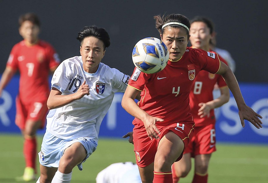 Li Jiayue (R) of China vies with Su Yu-Hsuan of Chinese Taipei during their group A match at the 2022 AFC Women's Asian Cup in Mumbai, India, Jan. 20, 2022. (Xinhua/Javed Dar)