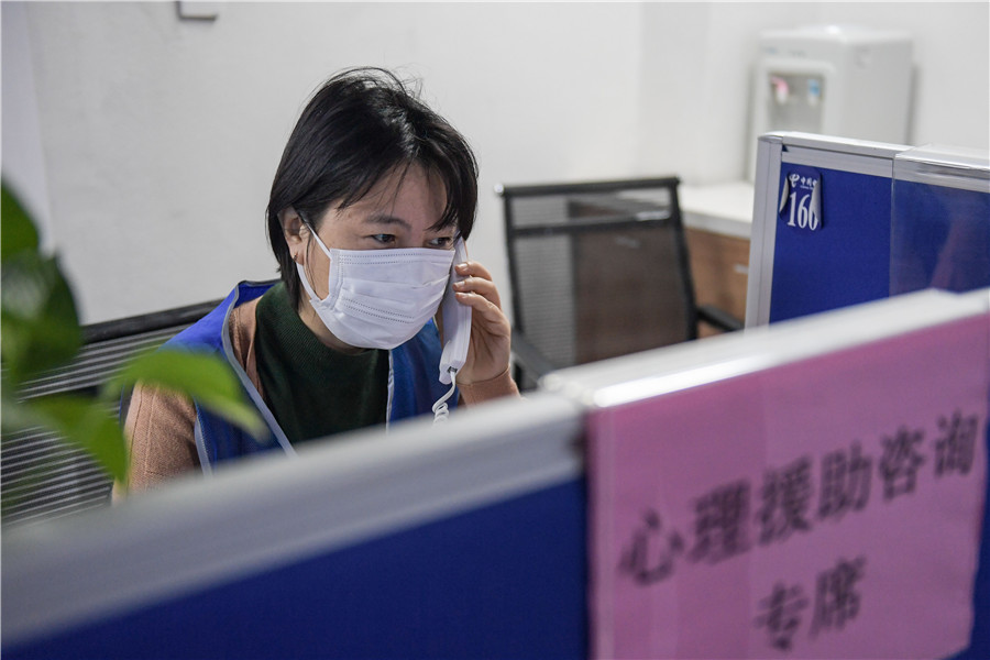 A psychological counselor in Haikou, Hainan province, answers a phone call about the novel coronavirus outbreak on Feb 1, 2020. [Photo/Xinhua]