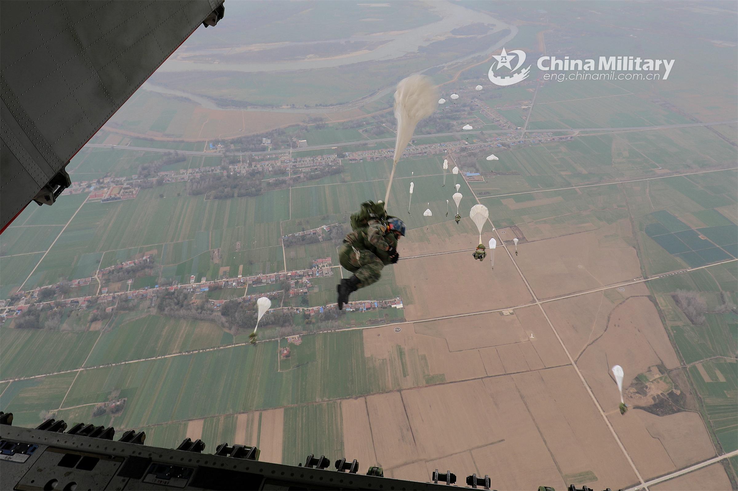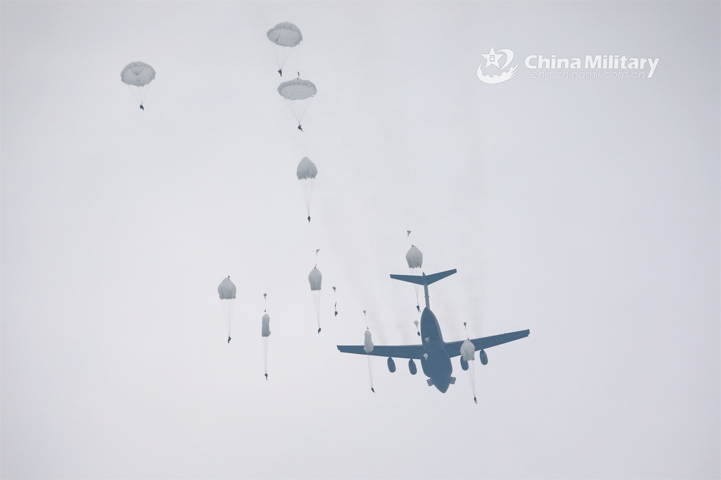 Airmen assigned to an airborne brigade of the PLA Air Force descend to the drop zone with their parachutes during a parachuting training exercise in late December, 2022. (eng.chinamil.com.cn/Photo by Ma Pengfei)