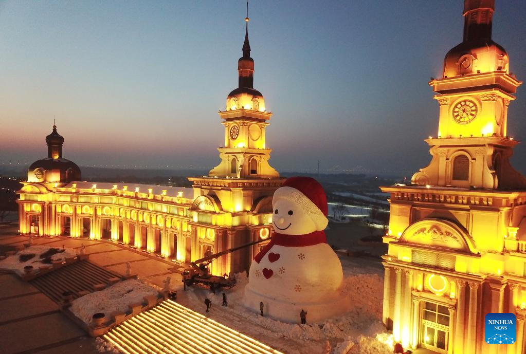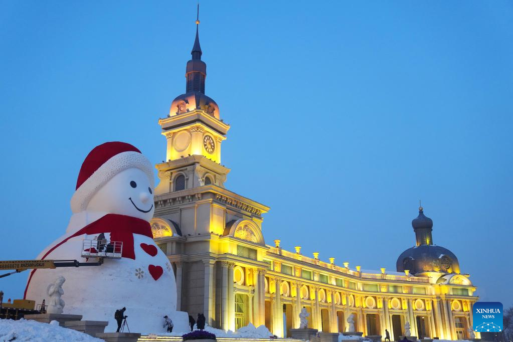 Workers do finishing work of the giant snowman near the Songhua river in Harbin, northeast China's Heilongjiang Province, Jan. 4, 2023. (Xinhua/Zhang Tao)