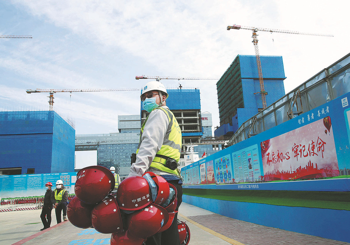 A worker collects helmets at a construction site in the Yizhuang area in Beijing on March 16, 2020. [Photo by Zou Hong/China Daily]