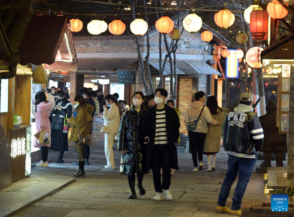 People walk on Leijie street, a commercial area famous for its night economy, in Hefei, east China's Anhui Province, Jan. 6, 2023. The night-time consumption in the commercial area has resumed in an orderly manner recently. (Xinhua/Zhou Mu)