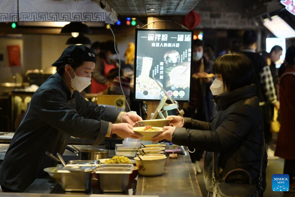 A woman takes food in a restaurant on Leijie street, a commercial area famous for its night economy, in Hefei, east China's Anhui Province, Jan. 6, 2023. The night-time consumption in the commercial area has resumed in an orderly manner recently. (Xinhua/Zhou Mu)
