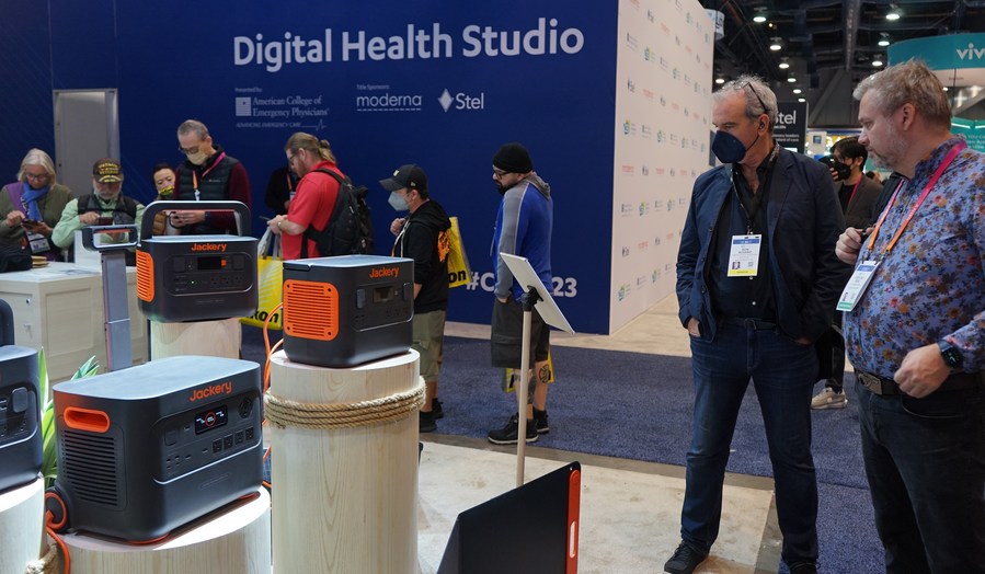 People visit the exhibition area of Chinese company Jackery during the 2023 Consumer Electronics Show (CES) in Las Vegas, the United States, Jan. 6, 2023. (Photo by Zeng Hui/Xinhua)