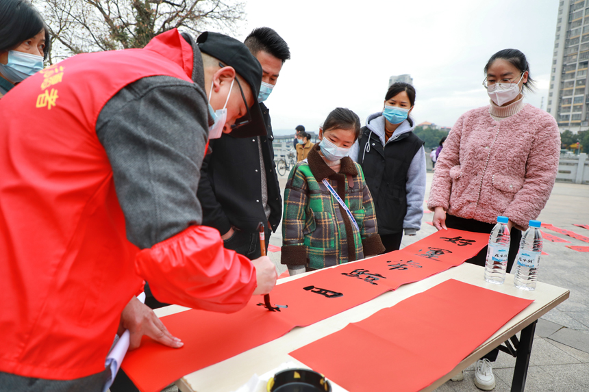 A volunteer from Quannan county’s calligrapher association writes red couplets for residents free of charge at a park in Quannan county, Ganzhou, east China’s Jiangxi Province. (Photo/Yin Qiqi)