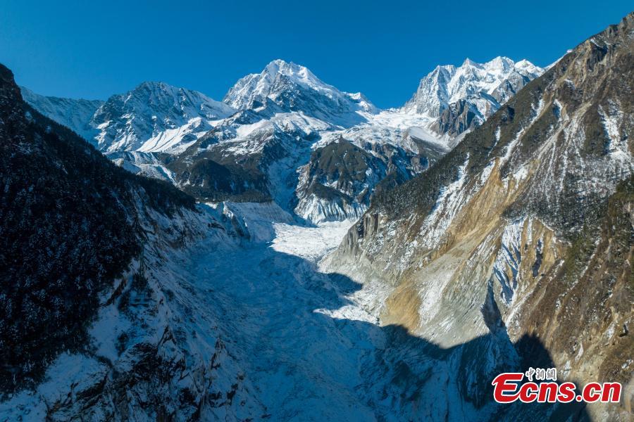 Aerial photo taken on Jan. 9, 2023 shows an icefall coming down from Gongga Mountain in Hailuogou Glacier Park of Luding County, Sichuan Province, four months after the park was rattled by a magnitude-6.8 earthquake. (Photo: China News Service/Liu Zhongjun)
