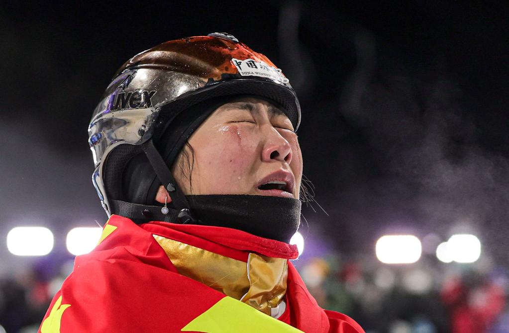 Xu Mengtao of China reacts after the freestyle skiing women's aerials final of Beijing 2022 Winter Olympics at Genting Snow Park in Zhangjiakou, north China's Hebei Province, Feb. 14, 2022. (Xinhua/Wu Zhuang)