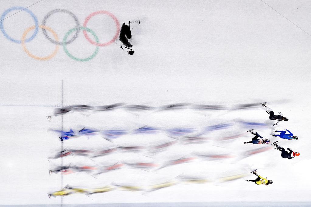 Multiple exposed photo taken on Feb. 11, 2022 shows athletes competing during the women's 1,000m final of short track speed skating at the Beijing 2022 Olympic Winter Games in Beijing, capital of China, Feb. 11, 2022. (Xinhua/Xu Zijian)