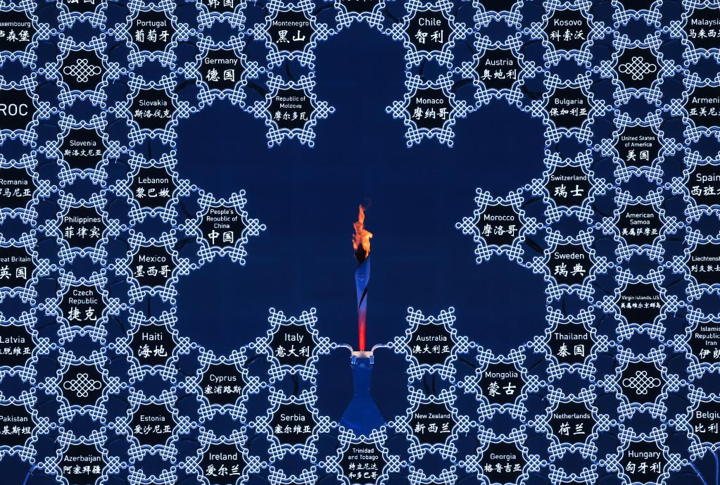 Photo taken on Feb. 4, 2022 shows a cauldron holding the Olympic flame during the opening ceremony of the Beijing 2022 Olympic Winter Games at the National Stadium in Beijing, capital of China. (Xinhua/Cao Can)