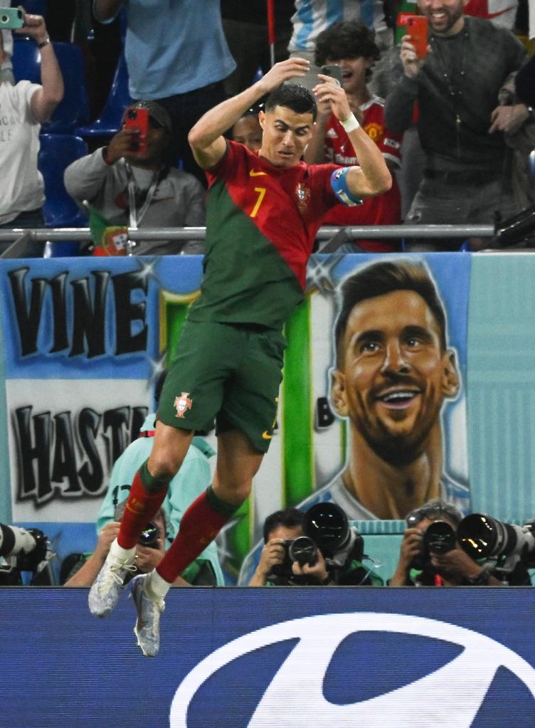 Cristiano Ronaldo of Portugal celebrates after scoring during the Group H match between Portugal and Ghana at the 2022 FIFA World Cup at Ras Abu Aboud (974) Stadium in Doha, Qatar, Nov. 24, 2022. (Xinhua/Li Ga)