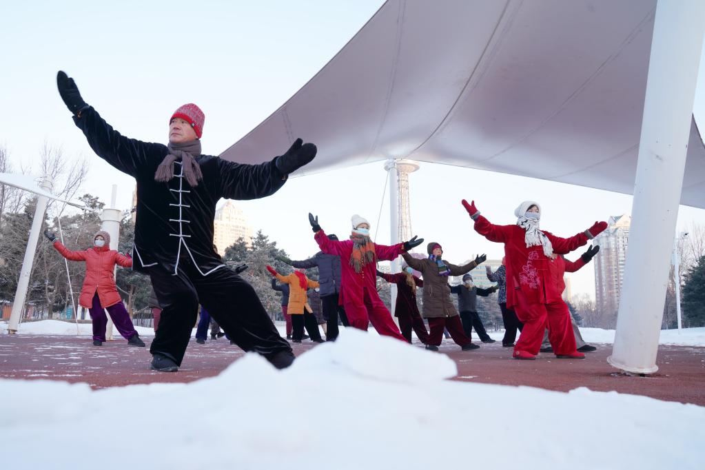People do exercise at a park in Harbin, northeast China's Heilongjiang Province, Jan. 2, 2022. (Xinhua/Wang Jianwei)