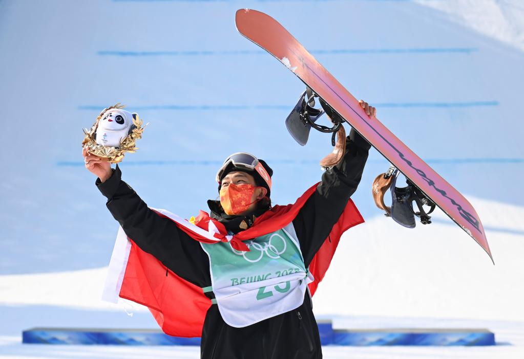 Su Yiming of China celebrates during the medal ceremony after the men's snowboard big air final of Beijing 2022 Winter Olympics at Big Air Shougang in Beijing, capital of China, Feb. 15, 2022. (Xinhua/Huang Zongzhi)
