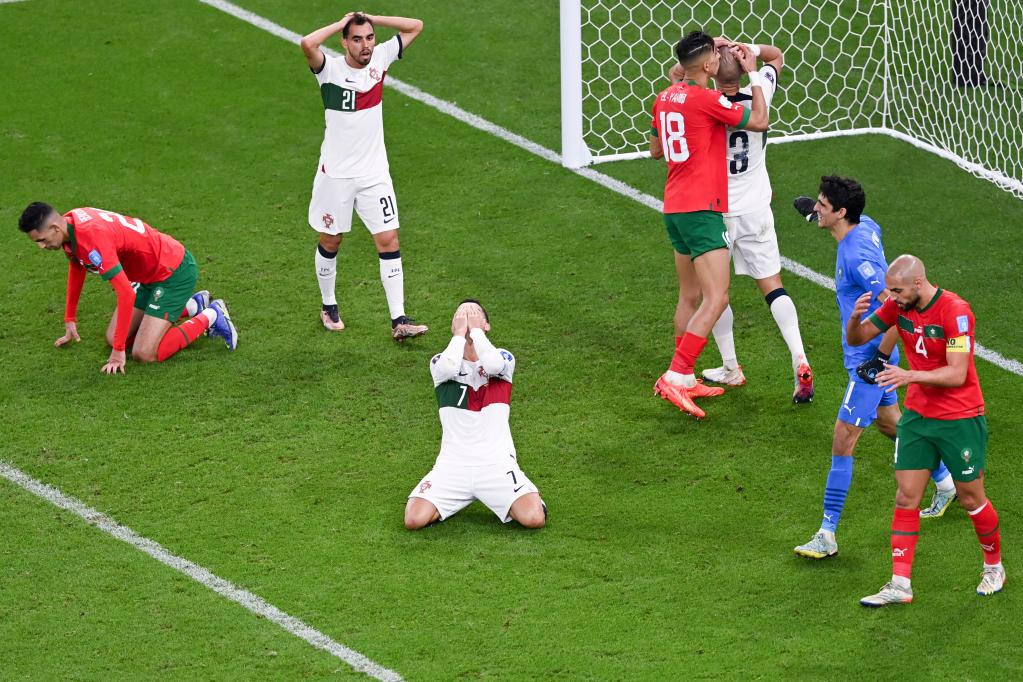 Cristiano Ronaldo (3rd L) of Portugal reacts during the quarterfinal between Morocco and Portugal of the 2022 FIFA World Cup at Al Thumama Stadium in Doha, Qatar, Dec. 10, 2022. (Xinhua/Li Jundong)