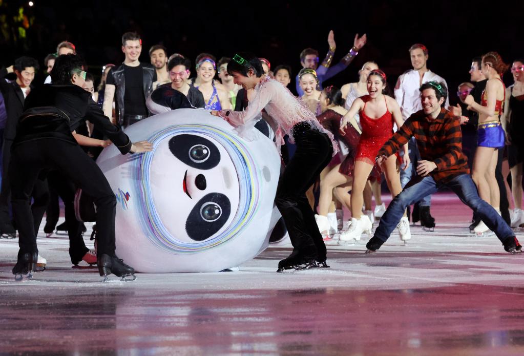 Figure skaters celebrate with the mascot of Beijing 2022 Olympic Winter Games Bing Dwen Dwen after the figure skating gala event of the Beijing 2022 Olympic Winter Games in Beijing, capital of China, Feb. 20, 2022. (Xinhua/Zhang Yuwei)