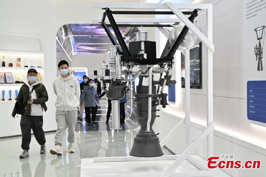Visitors view models of liquid fuel engine for carrier rockets at a commercial aerospace industry base in Guangzhou, south China's Guangdong Province. (Photo: China News Service/Chen Chuhong)
