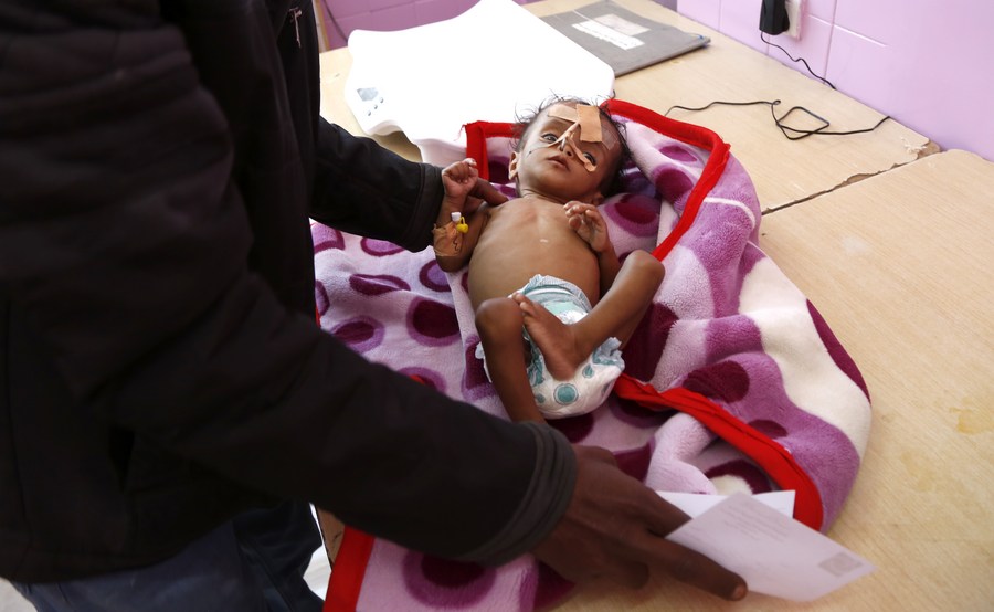 A man weighs his malnourished child at the malnutrition treating ward in a hospital in Sanaa, Yemen, March 13, 2022. (Photo by Mohammed Mohammed/Xinhua)