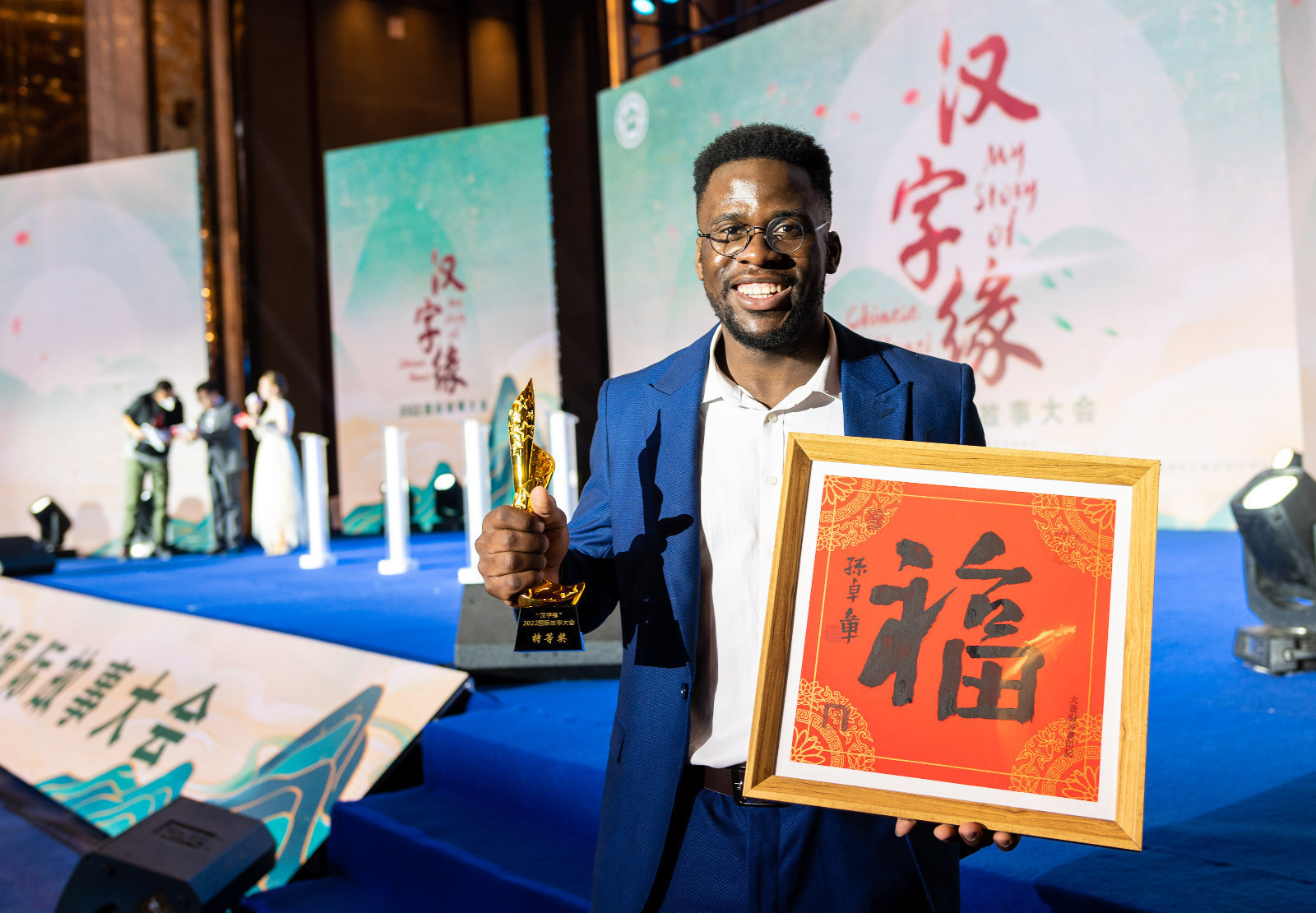 Seyi Essobo Pascal Axyan, winner of the grand prize of the 2022 “My Story of Chinese Hanzi” international competition, poses for a photo in Hohhot, north China’s Inner Mongolia Autonomous Region, Jan. 10, 2023. (Photo/Ding Genhou)