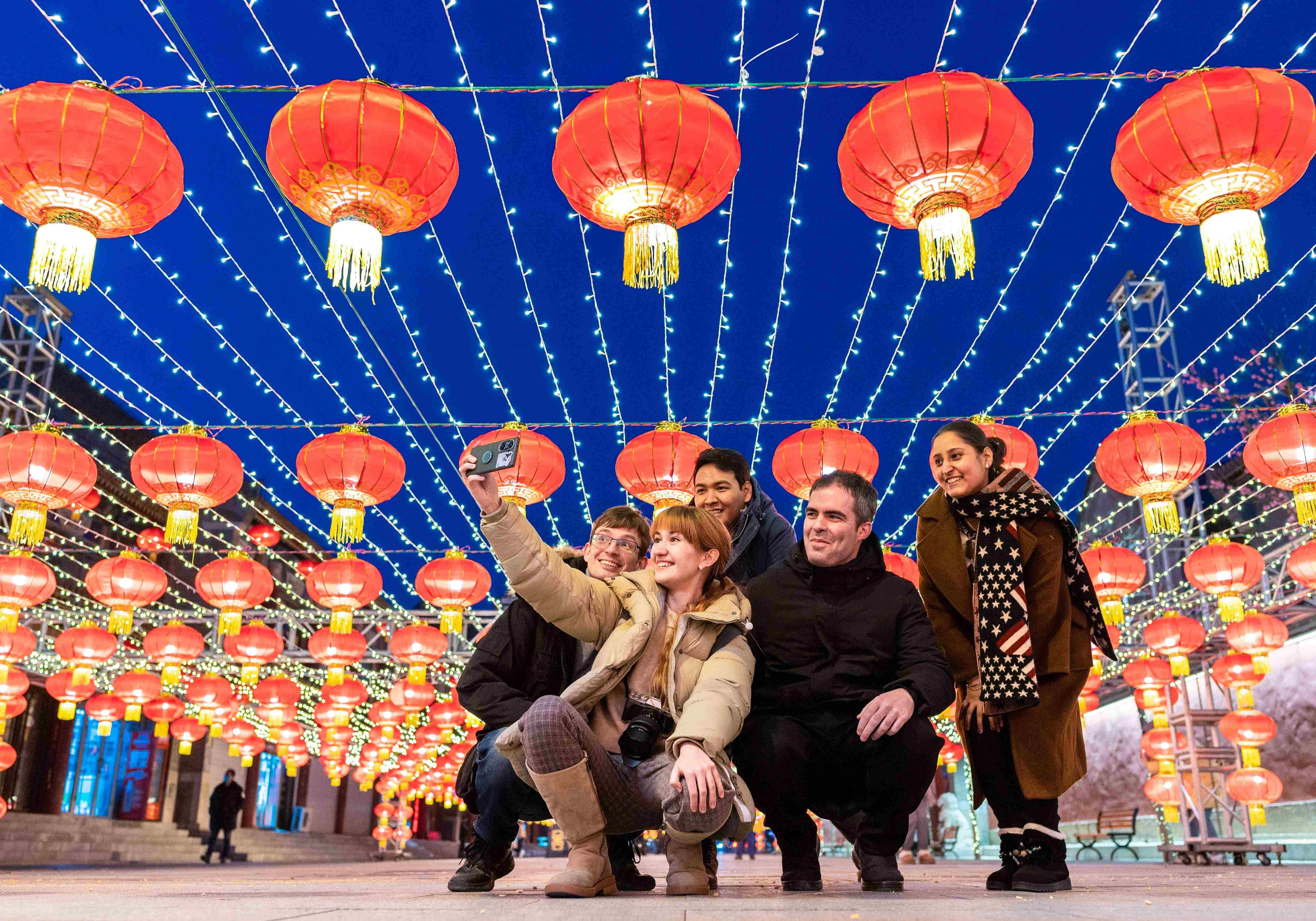 Contestants of the 2022 “My Story of Chinese Hanzi” international competition take photos at Saishang Old Street, Yuquan district, Hohhot, north China’s Inner Mongolia Autonomous Region, Jan. 10, 2023. (Photo/Ding Genhou)