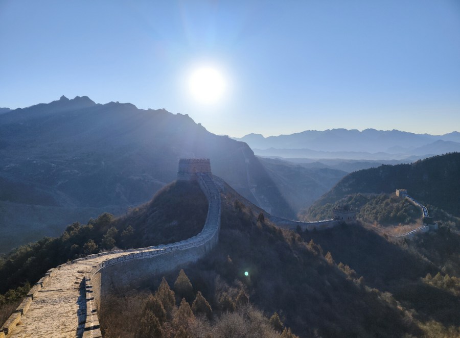 This photo taken on Jan. 1, 2023 shows the sunrise scenery at the Simatai section of the Great Wall in Miyun District, Beijing, capital of China. (Xinhua/Xing Guangli)