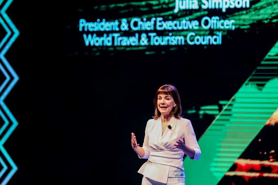 World Travel &Tourism Council (WTTC) president and CEO Julia Simpson speaks onstage during the WTTC Global Summit in Pasay City, the Philippines on April 21, 2022. (Xinhua/Rouelle Umali)