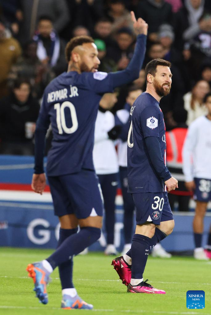 Paris Saint-Germain's Lionel Messi (R) and Neymar celebrate a goal during the French League 1 football match between Paris Saint-Germain FC and Angers at the Parc des Princes stadium in Paris, Jan. 11, 2023. (Xinhua/Gao Jing)