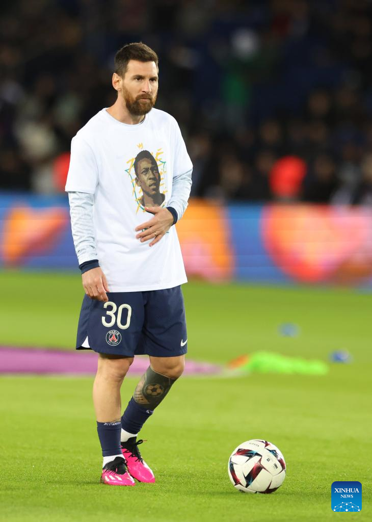 Paris Saint-Germain's Lionel Messi warms up before the French League 1 football match between Paris Saint-Germain FC and Angers at the Parc des Princes stadium in Paris, Jan. 11, 2023. (Xinhua/Gao Jing)