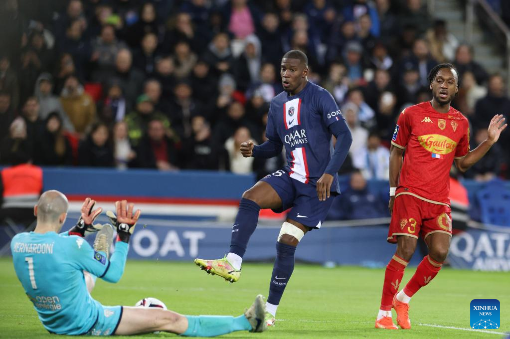 Paris Saint-Germain's Nordi Mukiele (C) shoots during the French League 1 football match between Paris Saint-Germain FC and Angers at the Parc des Princes stadium in Paris, Jan. 11, 2023. (Xinhua/Gao Jing)
