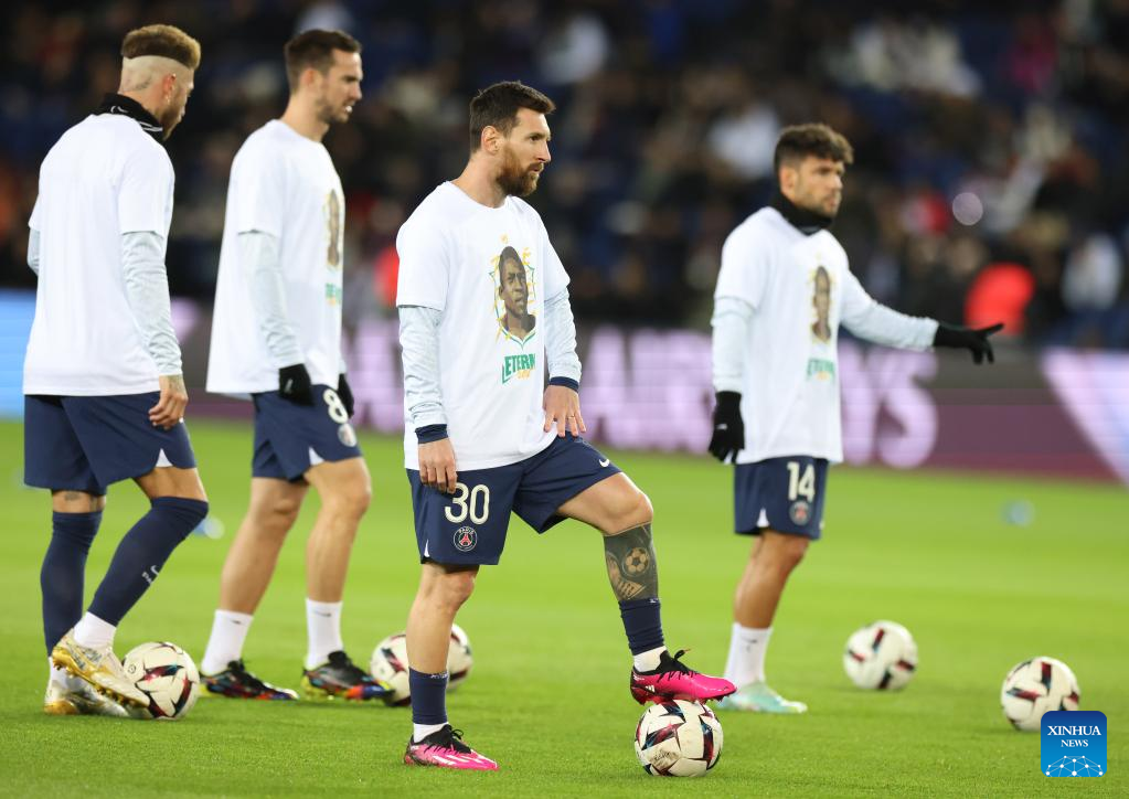 Paris Saint-Germain's Lionel Messi (front) warms up before the French League 1 football match between Paris Saint-Germain FC and Angers at the Parc des Princes stadium in Paris, Jan. 11, 2023. (Xinhua/Gao Jing)