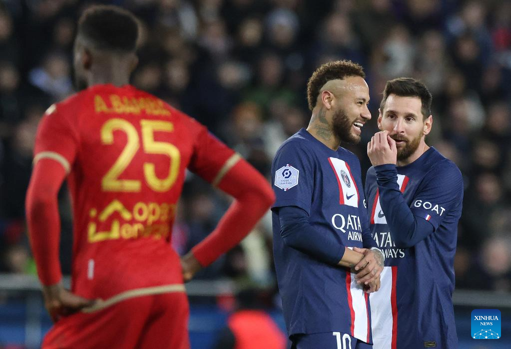 Paris Saint-Germain's Lionel Messi (R) and Neymar react during the French League 1 football match between Paris Saint-Germain FC and Angers at the Parc des Princes stadium in Paris, Jan. 11, 2023. (Xinhua/Gao Jing)