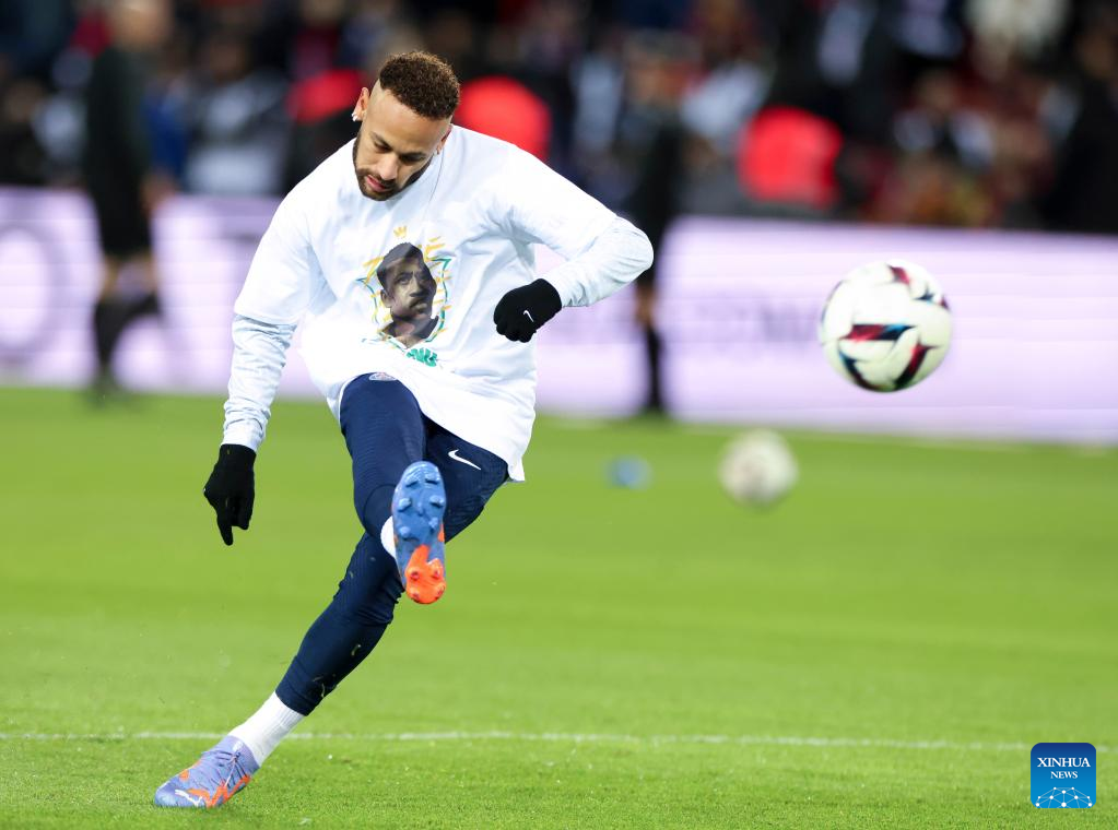 Paris Saint-Germain's Neymar warms up before the French League 1 football match between Paris Saint-Germain FC and Angers at the Parc des Princes stadium in Paris, Jan. 11, 2023. (Xinhua/Gao Jing)