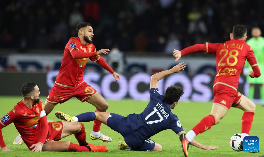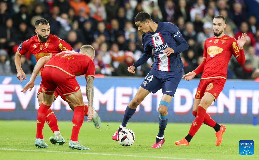 Paris Saint-Germain's Vitor Machado Ferreira (2nd R) vies for the ball during the French League 1 football match between Paris Saint-Germain FC and Angers at the Parc des Princes stadium in Paris, Jan. 11, 2023. (Xinhua/Gao Jing)