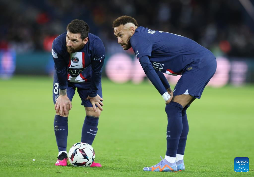 Paris Saint-Germain's Lionel Messi (L) and Neymar look on during the French League 1 football match between Paris Saint-Germain FC and Angers at the Parc des Princes stadium in Paris, Jan. 11, 2023. (Xinhua/Gao Jing)