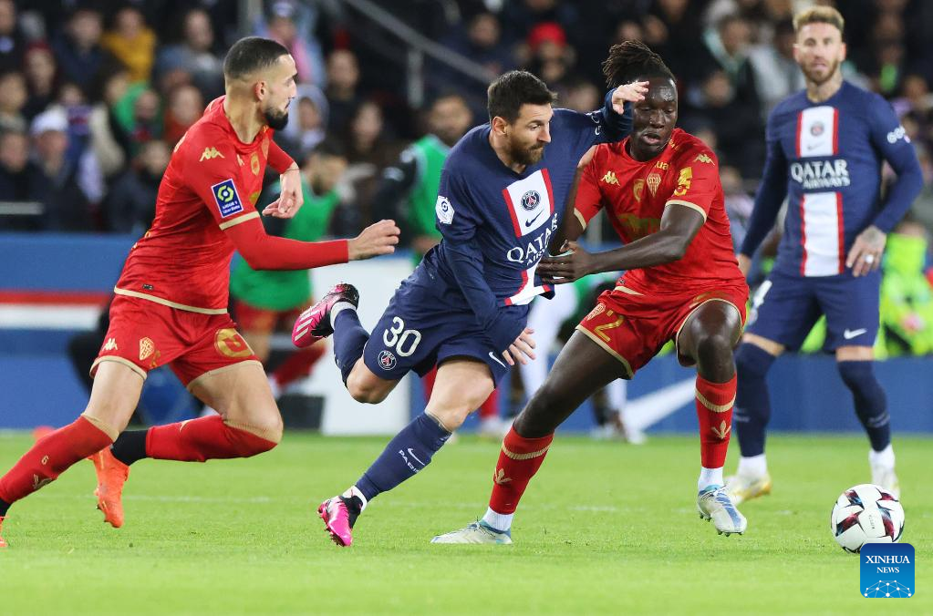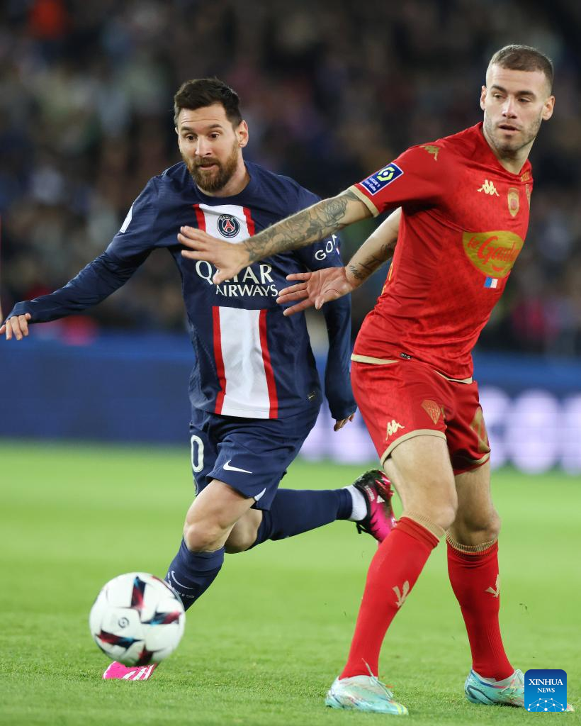 Paris Saint-Germain's Lionel Messi (L) dribbles during the French League 1 football match between Paris Saint-Germain FC and Angers at the Parc des Princes stadium in Paris, Jan. 11, 2023. (Xinhua/Gao Jing)