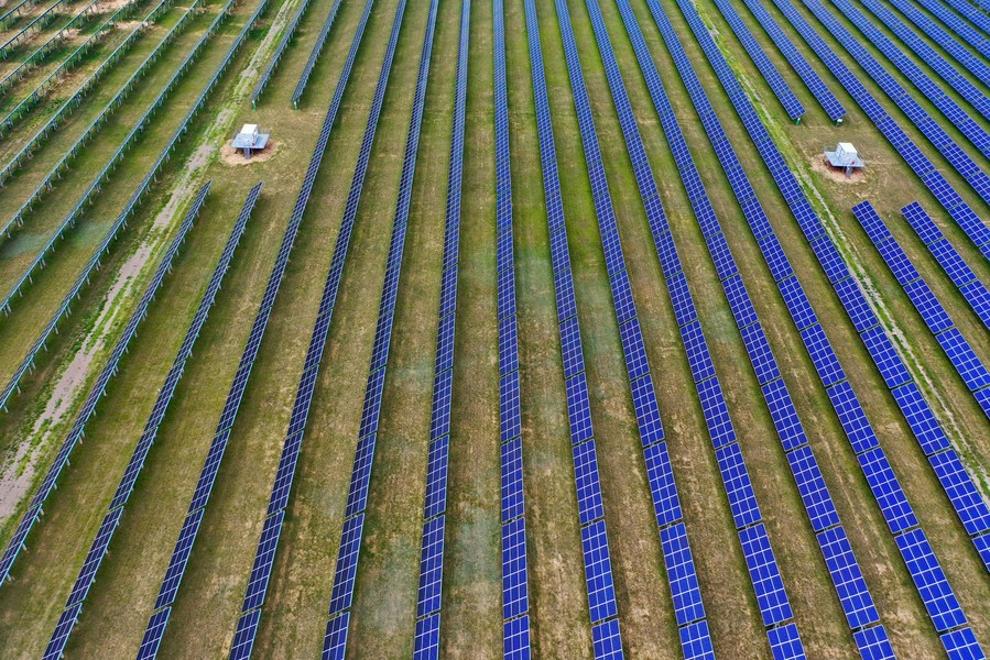 Aerial photo taken on Aug. 3, 2021 shows a photovoltaic power station in Tujing Village, Yunzhou District of Datong City, north China's Shanxi Province. (Xinhua/Cao Yang)