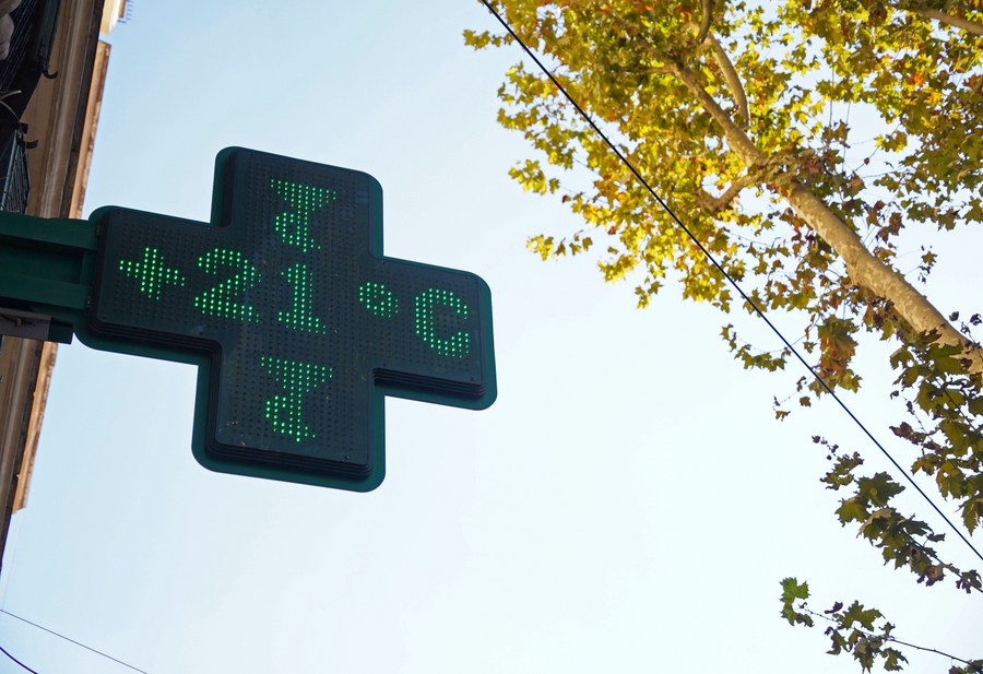 This photo taken on Nov. 11, 2022 shows a thermometer displaying real time temperature as 21 degrees Celsius in Rome, Italy. (Xinhua/Jin Mamengni)