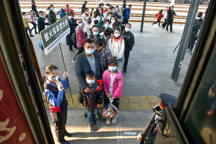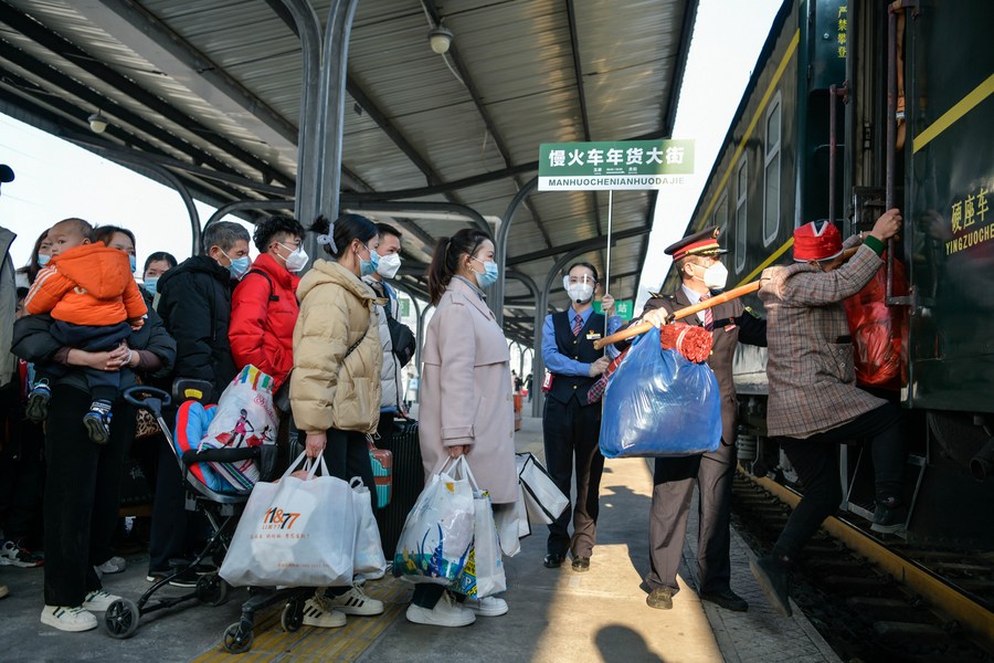 Passengers line up to board train No. 5640 at Kaili Railway Station in Kaili, southwest China's Guizhou Province, Jan. 10, 2023. (Xinhua/Yang Wenbin)