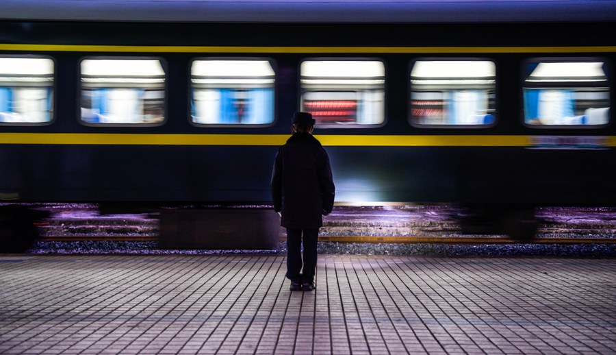 A worker sees off train No. 5640 at Zhenyuan Railway Station in Zhenyuan County, southwest China's Guizhou Province, Jan. 10, 2023. (Xinhua/Yang Wenbin)■