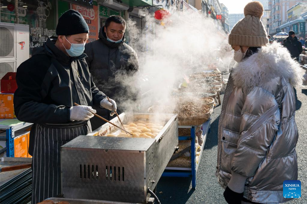 Local residents buy fried dough twist (or Mahua), a traditional Chinese snack, at an open air market for Spring Festival goods in Suifenhe, northeast China's Heilongjiang Province, Jan. 12, 2023. As the Chinese Lunar New Year approaches, many citizens in Suifenhe flocked to local markets to make special purchases for the upcoming Spring Festival. (Xinhua/Xie Jianfei)