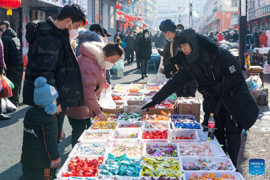 Local residents buy candies at an open air market for Spring Festival goods in Suifenhe, northeast China's Heilongjiang Province, Jan. 12, 2023. As the Chinese Lunar New Year approaches, many citizens in Suifenhe flocked to local markets to make special purchases for the upcoming Spring Festival. (Xinhua/Xie Jianfei)