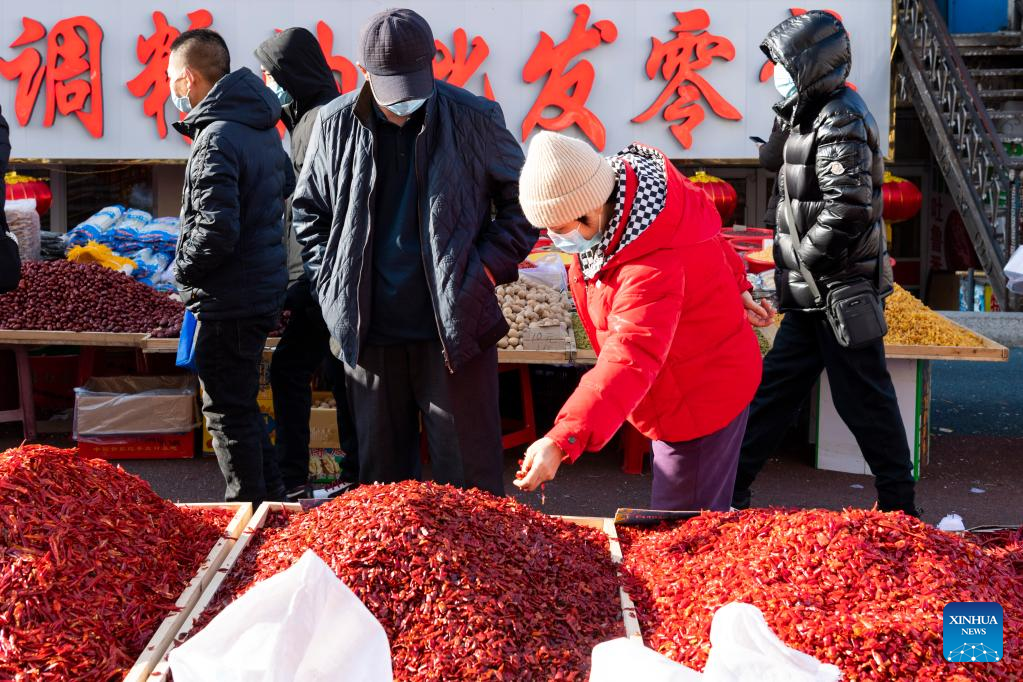 Local residents shop at an open air market for Spring Festival goods in Suifenhe, northeast China's Heilongjiang Province, Jan. 12, 2023. As the Chinese Lunar New Year approaches, many citizens in Suifenhe flocked to local markets to make special purchases for the upcoming Spring Festival. (Xinhua/Xie Jianfei)