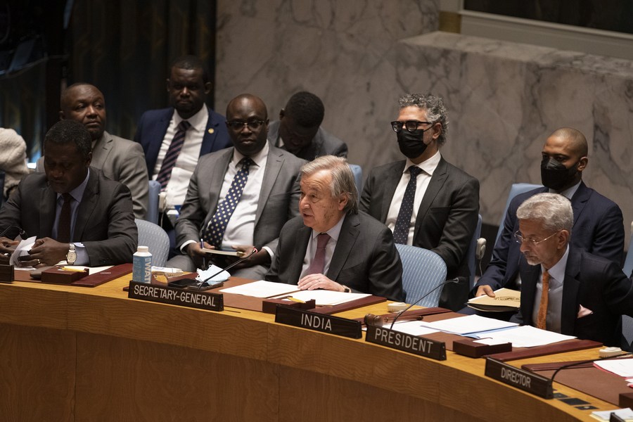 United Nations Secretary-General Antonio Guterres (C, front) speaks at a Security Council meeting on multilateralism at the UN headquarters in New York, Dec. 14, 2022. (Xinhua/Xie E)