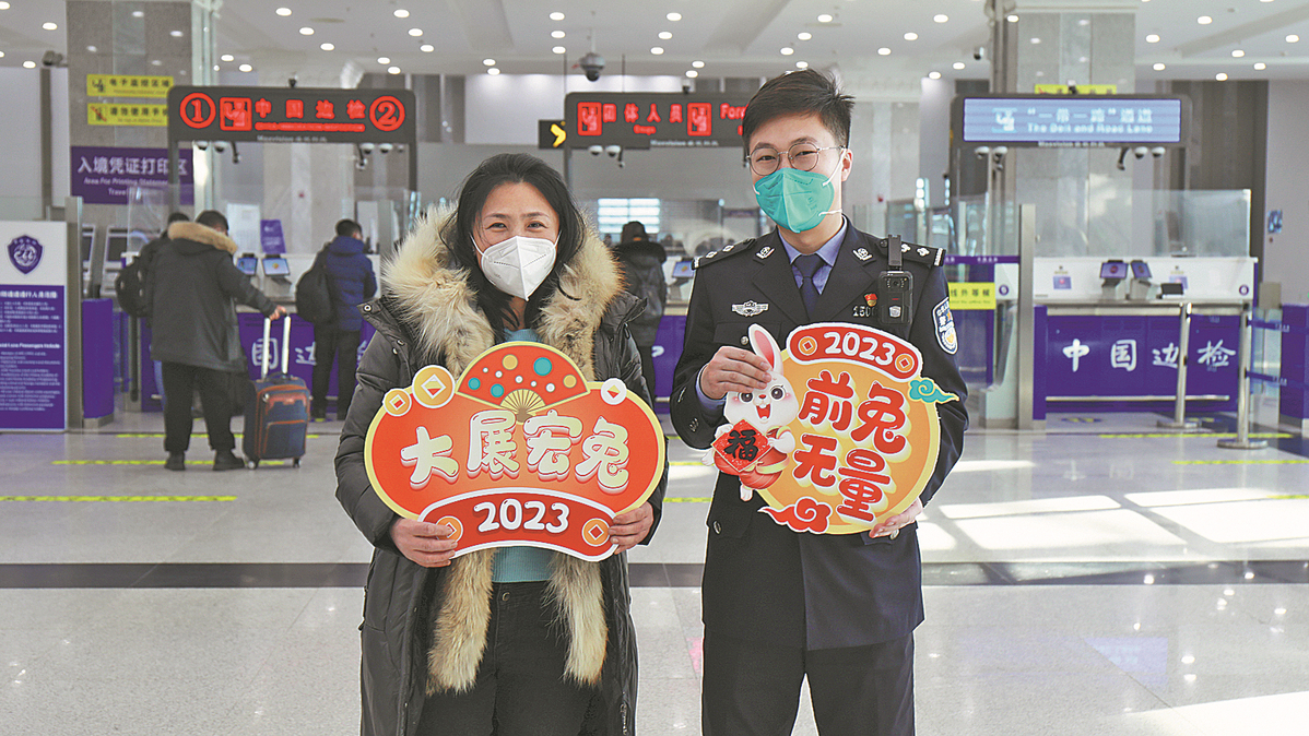 Customs officers welcome inbound travelers at Manzhouli Port, Inner Mongolia autonomous region. ANJILA/FOR CHINA DAILY