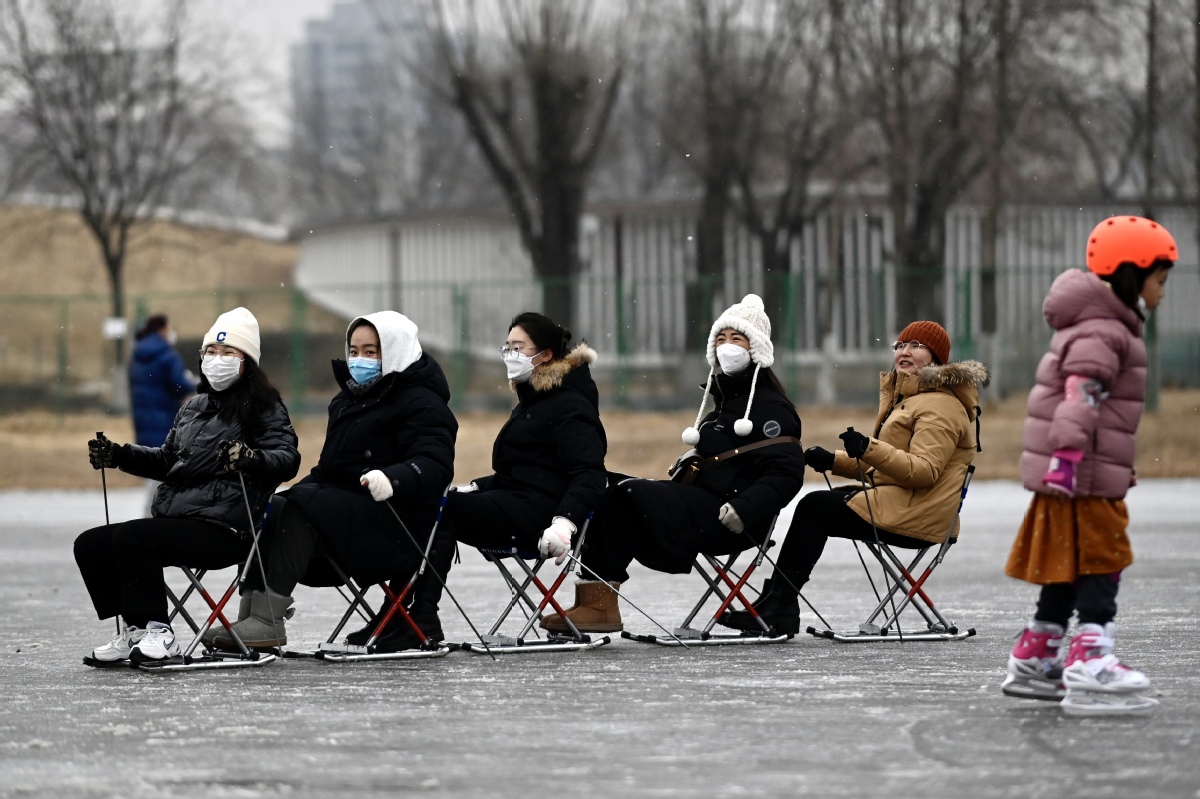 Citizens play in the snow near the National Olympic Stadium in Beijing on Jan 12, 2023. [Photo by Wei Xiaohao/chinadaily.com.cn]