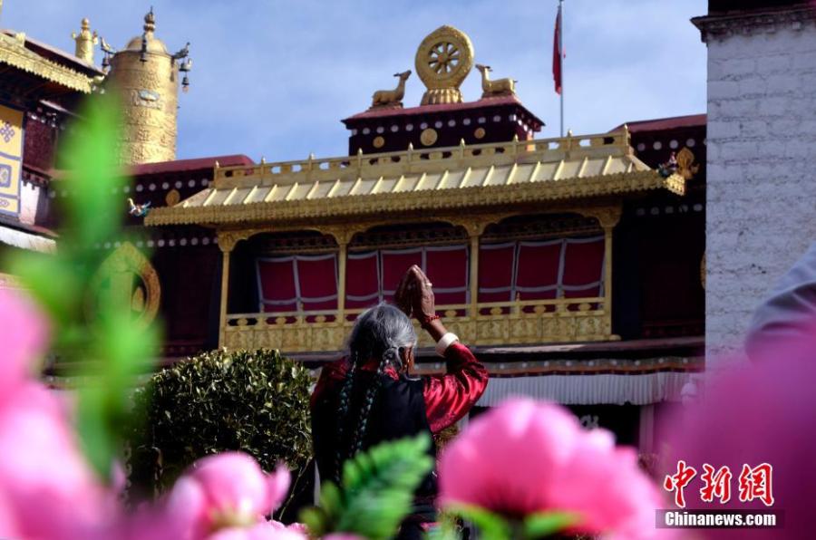 A pilgrim kowtows in front of the Jokhang Temple in Lhasa, southwest China's Tibet Autonomous Region Jan. 12, 2023. (Photo: China News Service/Li Lin)