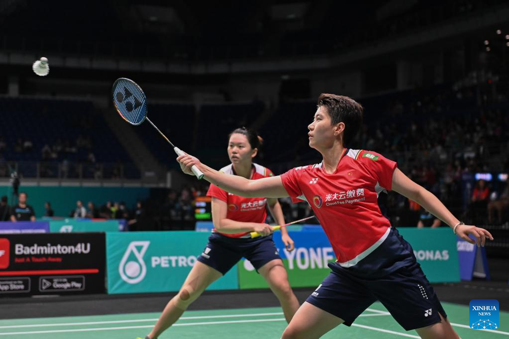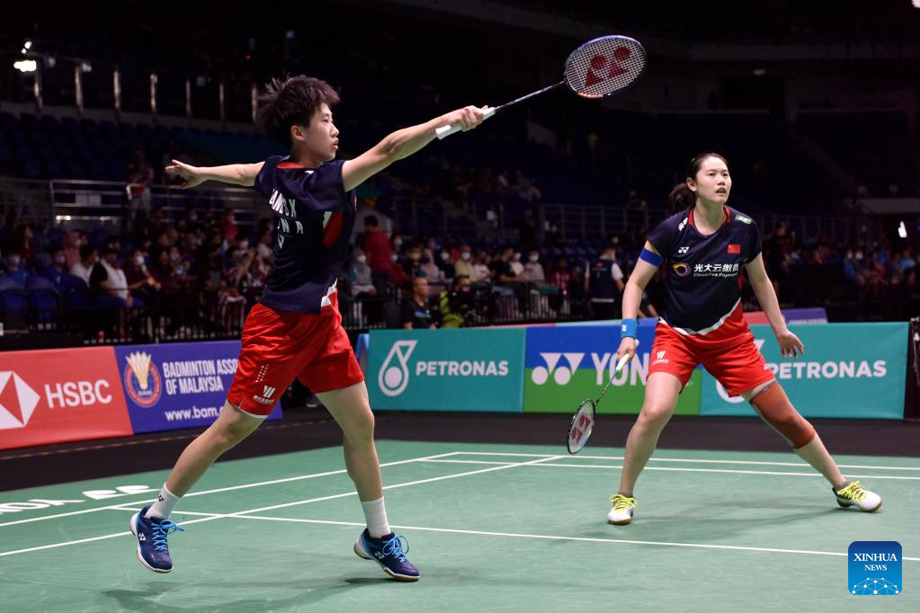 China's Du Yue (R)/Xia Yuting compete during the women's doubles round of 16 match against teammates Li Wenmei/Liu Xuanxuan at Malaysia Open 2023 in Kuala Lumpur, Malaysia, Jan. 12, 2023. (Photo by Chong Voon Chung/Xinhua)