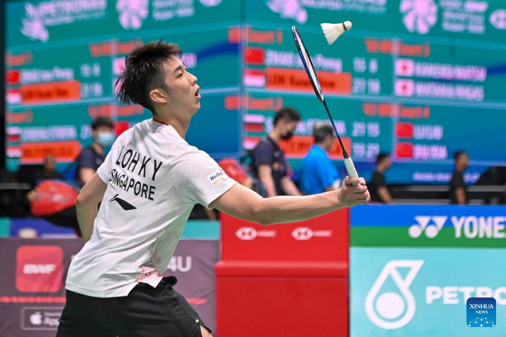 Singapore's Loh Kean Yew competes during the men's singles round of 16 match against China's Zhao Junpeng at Malaysia Open 2023 in Kuala Lumpur, Malaysia, Jan. 12, 2023. (Photo by Chong Voon Chung/Xinhua)