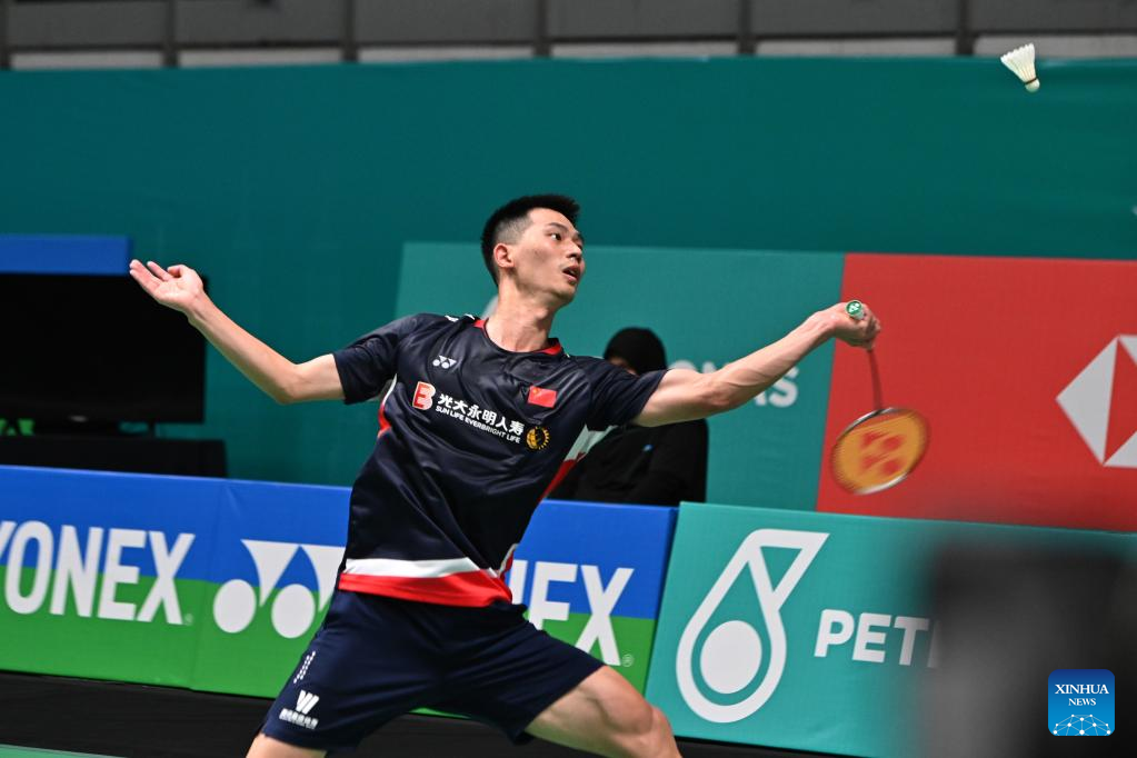China's Zhao Junpeng competes during the men's singles round of 16 match against Singapore's Loh Kean Yew at Malaysia Open 2023 in Kuala Lumpur, Malaysia, Jan. 12, 2023. (Photo by Chong Voon Chung/Xinhua)