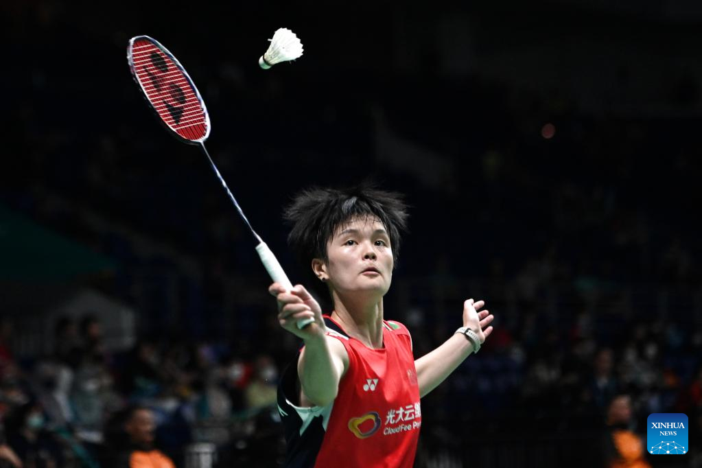 China's Wang Zhiyi hits a return during the women's singles round of 16 match against Chinese Taipei's Pai Yu Po at Malaysia Open 2023 in Kuala Lumpur, Malaysia, Jan. 12, 2023. (Photo by Chong Voon Chung/Xinhua)
