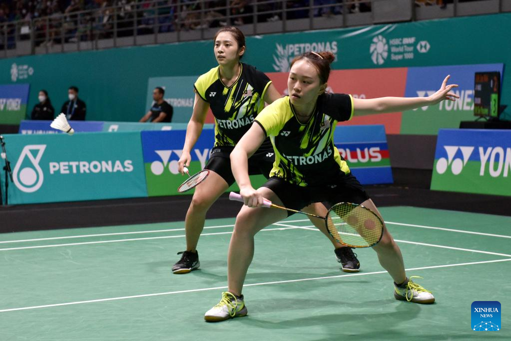 Malaysia's Go Pei Kee (R)/Teoh Mei Xing compete during the women's doubles round of 16 match against China's Zhang Shuxian/Zheng Yu at Malaysia Open 2023 in Kuala Lumpur, Malaysia, Jan. 12, 2023. (Photo by Chong Voon Chung/Xinhua)