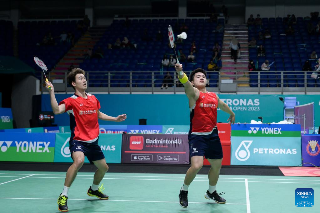 China's Liu Yuchen (L)/Ou Xuanyi compete during the men's doubles round of 16 match against Malaysia's Aaron Chia/Soh Wooi Yik at Malaysia Open 2023 in Kuala Lumpur, Malaysia, Jan. 12, 2023. (Photo by Chong Voon Chung/Xinhua)